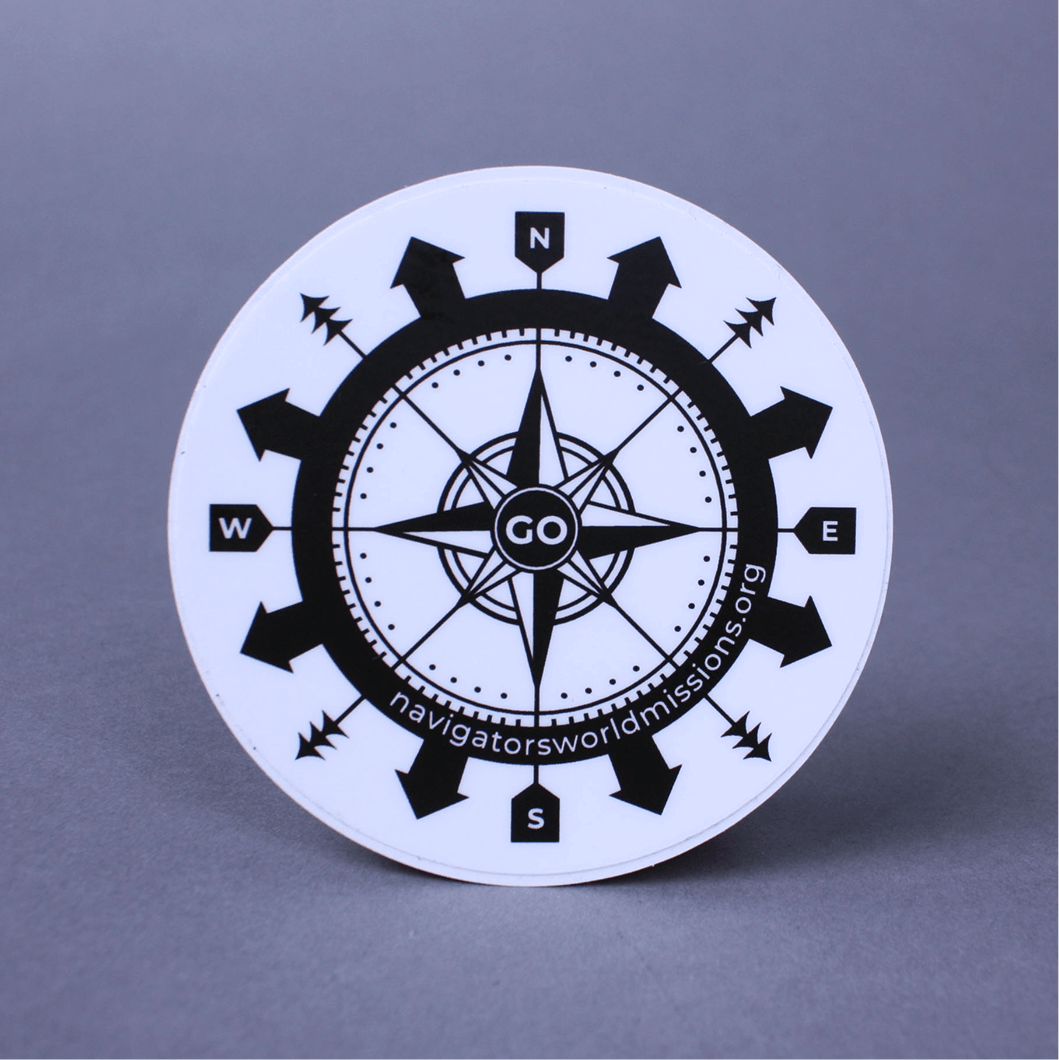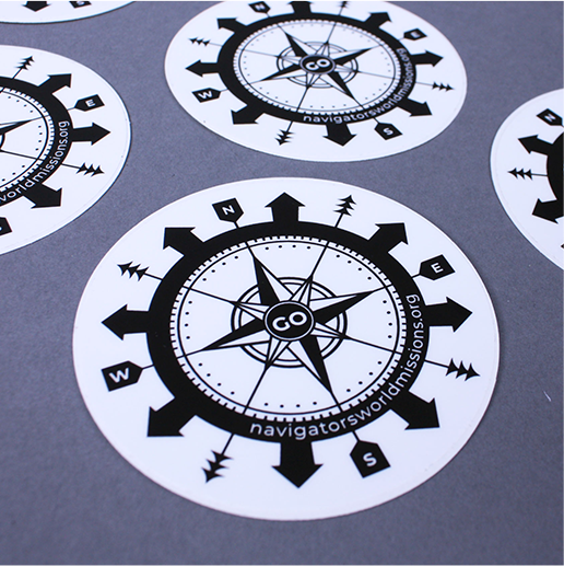 One thing I had to think through in creating this sticker was the use of symbolism. Using a globe seemed overdone in missions organizations, and I knew compasses were on the verge of being overused as well. But I thought I could make it different enough to set it apart. I was able to double the arrows around the circumference as houses and trees to give them a dual interpretation and further the concept of The Navigators being a global missions organization.